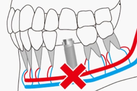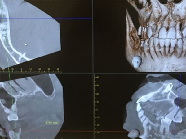 下顎の骨の中には重要な神経と血管が通っています。そこにインプラントのドリルが触れるなどの事態が起きれば神経が損傷して唇周囲が麻痺するなど重大な事故になります。そのため、手術前にCT撮影を行い、神経までの正確な距離を測定し、十分な安全域を見極めてから治療する必要があります。
