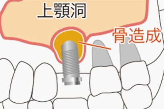 上顎の骨は薄く、その上には上顎洞(副鼻腔のはひとつ。蓄膿症で膿が溜まる場所)という空洞があります。もしインプラントが顎骨を突き抜けて上顎洞まで貫通してしまうと、感染が起き上顎洞炎を発症するリスクがあります。そのため骨の厚みが不足している場合は「上顎洞底挙上術」という骨造成(移植)処置を行う必要があります。この骨造成は高度な技術を要するので、経験と知識に裏付けされたインプラント執刀医が行うことが推奨されます。